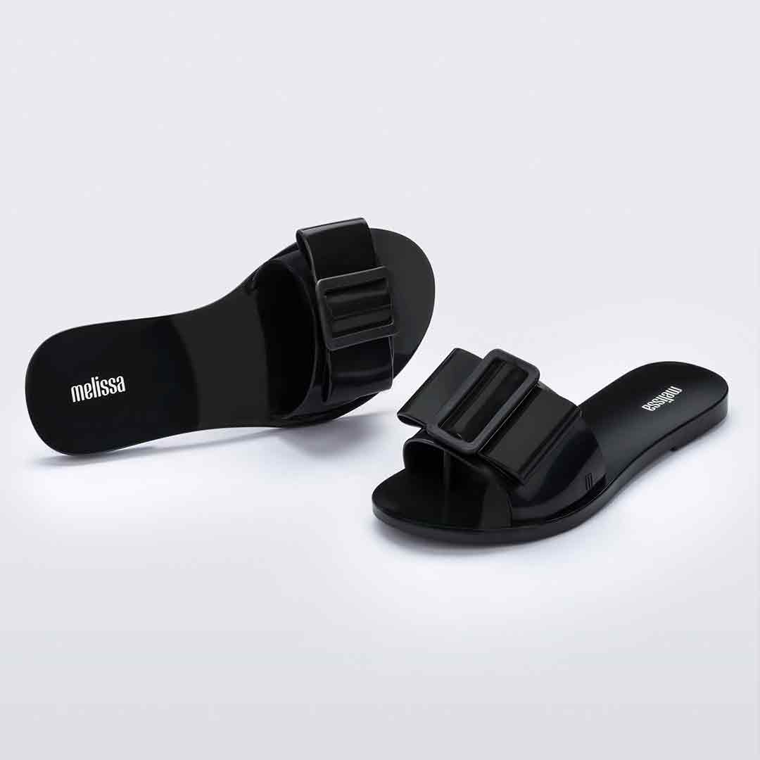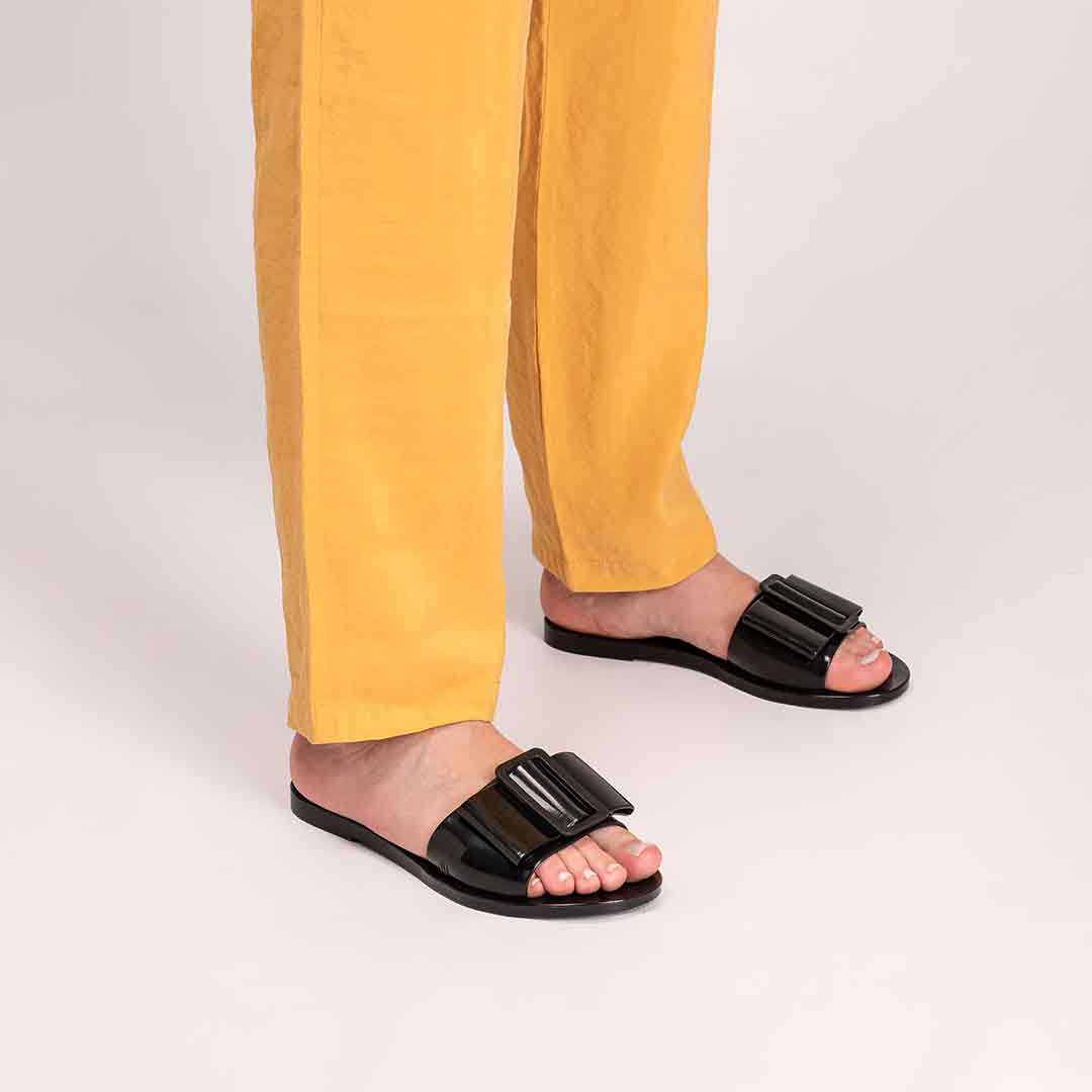Romanticism continues to shape the fashion landscape, bringing softer, more feminine silhouettes to the forefront, and the Melissa Babe is the perfect expression of that mood. This delicate slide features a single, elegant strap that creates a clean, refined fit, finished with a charming bow appliqué and buckle detail for just the right touch of extra style. Light, effortless, and beautifully constructed, it’s a go to choice for anyone who loves a subtle romantic accent in their everyday look.